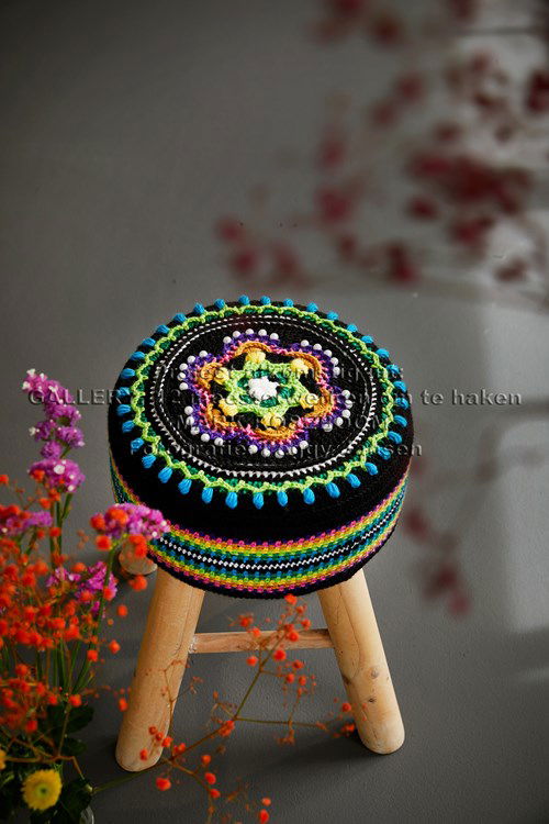 Haakpatroon Frida's Flower krukje, een ontwerp van mark Roseboom die zich bij dit ontwerp heeft laten inspireren door het schilderij Zelfportet II van Frida Kahlo. Deze hoes voor een krukje is gehaakt van het garen Scheepjes Merino Soft.