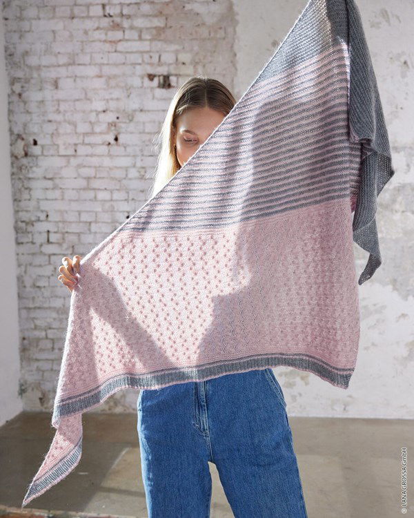 Lana Grossa breipatroon driehoekige omslagdoek met stepen en verschillende steekpatronen. Deze tweekleurige sjaal is gemaakt van het garen Lana Grossa Ecopuno.