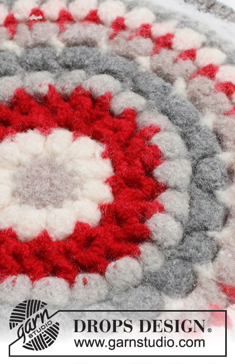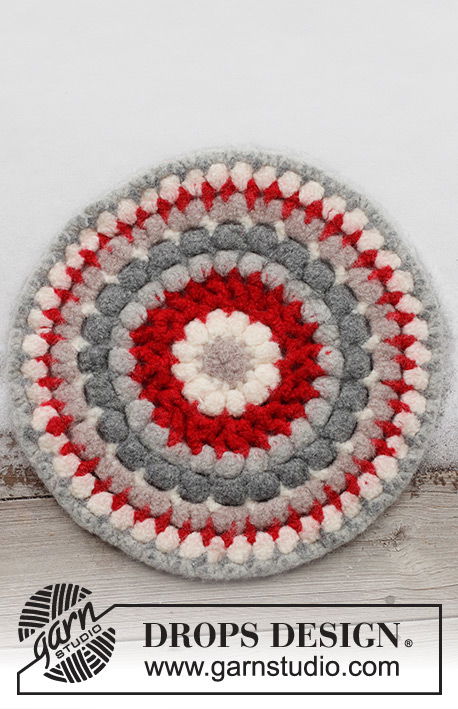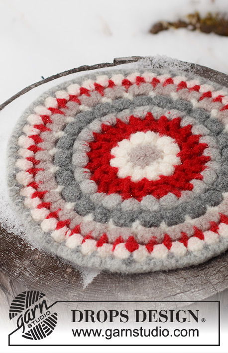 Gehaakte en gevilte zitmat in DROPS Snow. Het werk wordt in de rondte gehaakt vanuit het midden naar buiten toe.