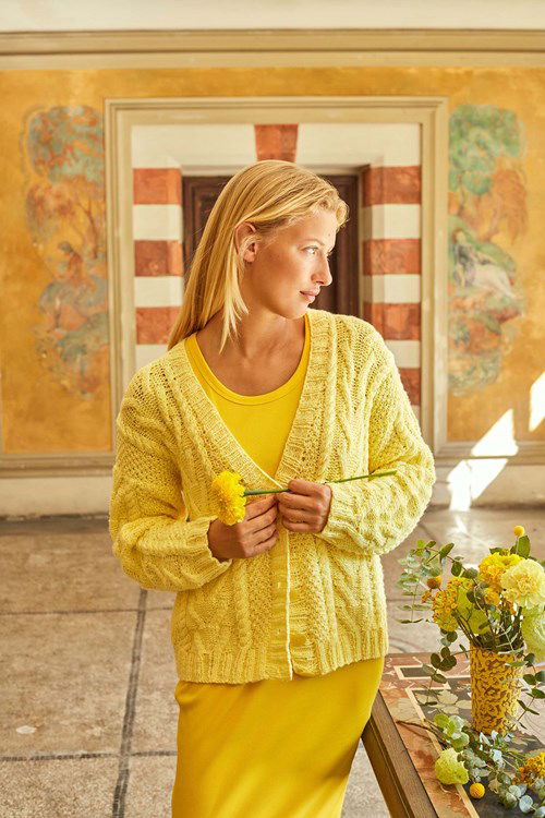 Breipatroon damesvest Pretty Flower met diepe v-hals, kabels en knoopsluiting. Het vest is gebreid van het Lang Yarns garen Wooladdicts Happiness. Een vrolijk vest in voorjaar/zomerkleuren, maar hij is natuurlijk te maken in elke mooie kleur Wooladdicts Happiness!