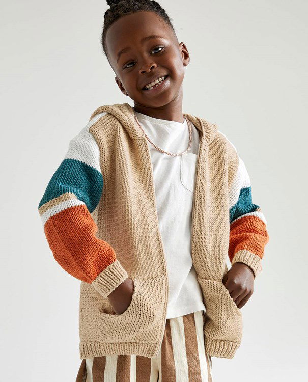 PHILDAR breipatroon Blouson Donald, kindervest met gekleurde banen in de mouwen die doorlopen over de schouders. Dit vest met capuchon is in tricotsteek gebreid van het garen Phildar Green.