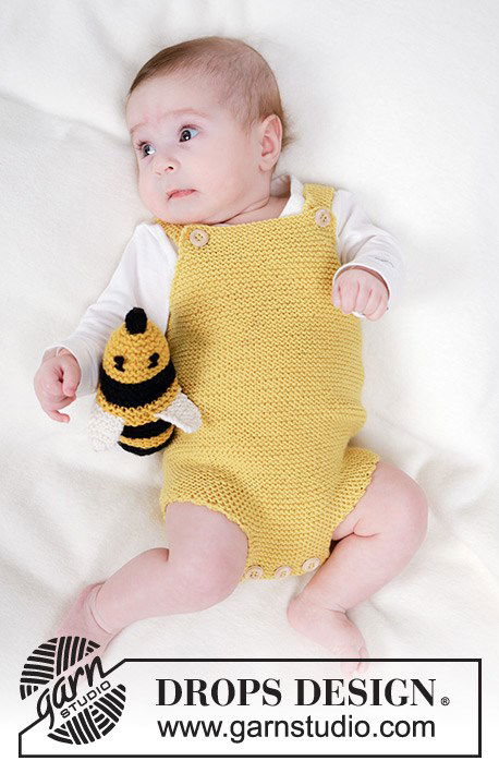 GARNSTUDIO breipatroon Bumblebee Romper, romper in ribbelsteek. Dit rompertje is gemaakt van het garen DROPS Baby Merino.