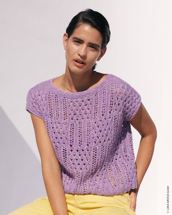 Lana Grossa breipatroon damestrui met kantpatroon en korte mouwen. Deze luchtige top is gemaakt van de garens Lana Grossa Elastico en Lana Grossa Bella.
