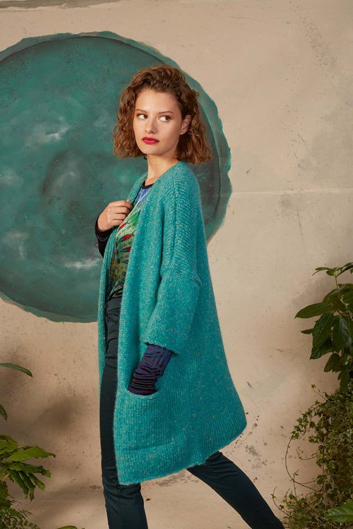 Lang Yarns breipatroon Adele, lang damesvest met vierkante zakken. Dit lange vest met driekwart mouwen is gemaakt van het garen Lang Yarns Yoko.