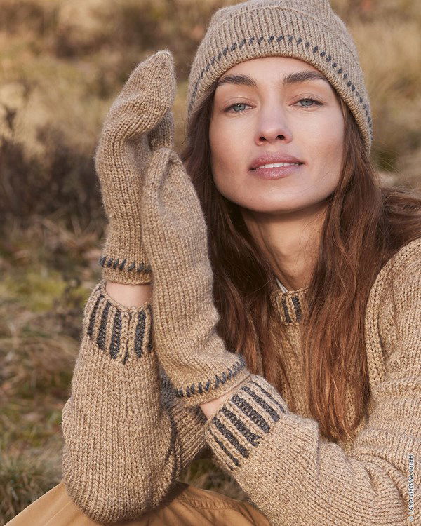 Lana Grossa breipatroon muts met borduurwerk langs de rand, Deze muts en wanten zijn gemaakt van het garen Lana Grossa New Classic, een draad met een natuurlijk uiterlijk.