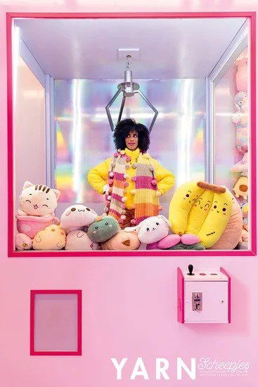 Scheepjes breipatroon Illusion Strped Wrap van ca 180 a 40 cm. Deze sjaal met aan beide zijden 22 pompons groot en klein, is gemaakt van het garen Scheepjes River Washed XL>