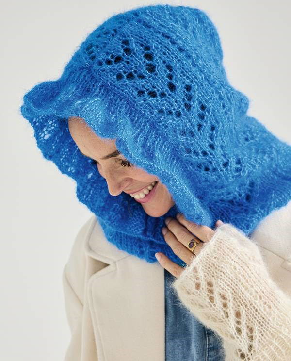 Phildar breipatroon Dixie, muts in ajourpatroon. Deze gesloten muts is omrand met gerimpelde rand en is gemaakt van het garen Phil Mohair Soie.