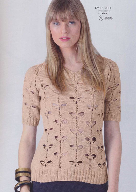 Phildar breipatroon damesshirt met korte raglanmouwen. Dit zomerse truitje met opengewerkt vlinderpatroon, is gemaakt van het garen Phil Coton 3, een soepel 100% katoenen draad.