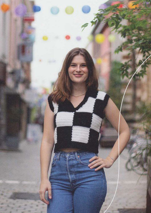 Haakpatroon Brunch, geblokte spencer met V-hals, gehaakt van het garen Durable Double four.