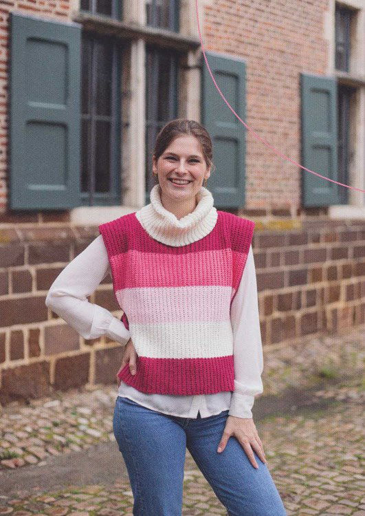 Haakpatroon met de naam Winter, een mouwloze trui met wijde dubbele kraag. Deze gestreepte spencer is gehaakt van het garen Double Four.