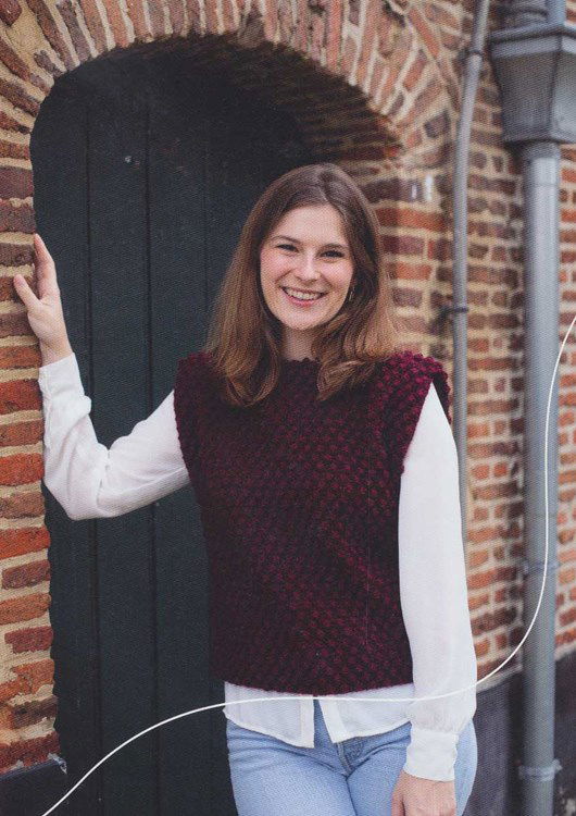 Haakpatroon in popcorn patroon, ziet er moeilijk uit, maar is eenvoudig te haken. Deze gebobbelde mouwloze trui zonder m mouwen, is gehaakt van het garen Scheepjes Colour Crafter, op haaknaald nr 5.