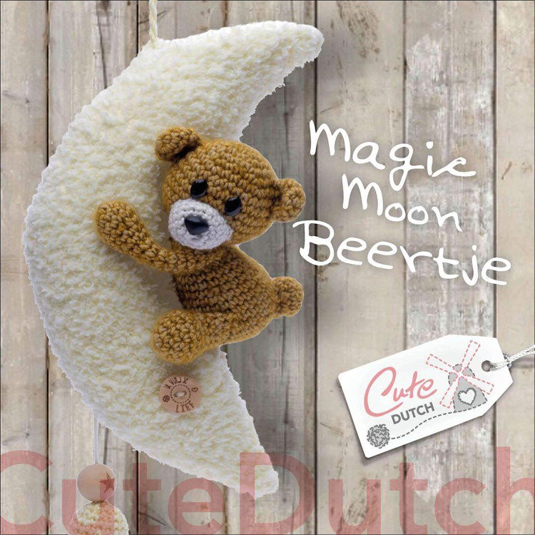 Haakpatroon Magic moon beertje, waarbij in de maan een muziekdoosje met trekkoord is verwerkt. Deze muziekmobiel is ca 27 cm groot en gehaakt van het garen Stonewashed en Catona van Scheepjes.
