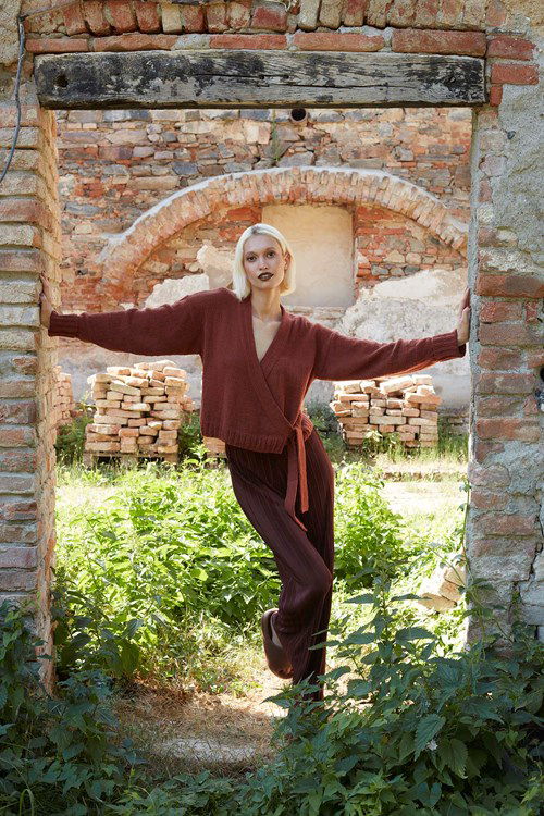 Lang Yarns breipatroon wikkelvest voor dames met dubbel geslagen manchetten. Dit vest is gebreid in tricotsteek, van met garen Langyarns Bliss.