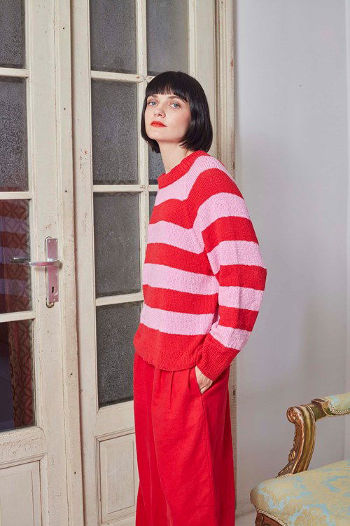 Lang Yarns breipatroon damestrui met raglanmouwen. De strepen van voor en achterpand lopen door in de mouwen. De trui is gebreid in tricotsteek, met het garen Langyarns Bliss.