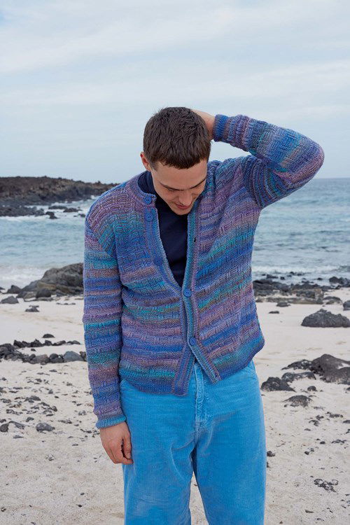 Lang Yarns breipatroon David, herentrui met smalle verticalele lijnen, die door horizontale lijnen worden onderbroken. Dit meerkleurige vest, is gemaakt van het garen Langyarns Lovis.