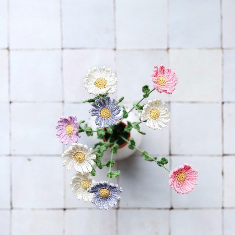 Haakpatroon Sascha Blase bloemen, margriet op steel. Het boeket is gehaakt op haaknaald nr 1,5 van het garen Scheepjes Maxi Sweet treat (Sugar Rush)