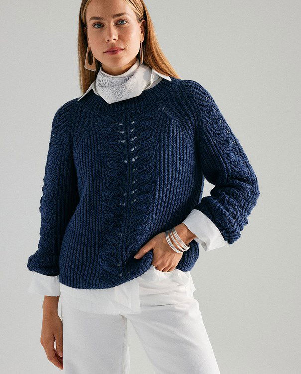 Phildar breipatroon trui Rafida, met raglanmouwen en ronde hals. Deze luxe damestrui met fraai ajourpatroon is voor de expert breister. De trui is gemaakt van het garen Phil Love Cotton, die het stekenpatroon duidelijk laat uitkomen.