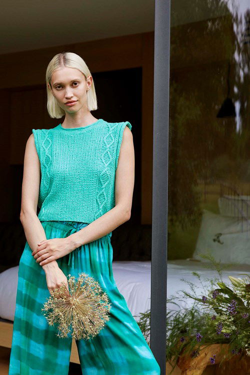 Langyarns breipatroon Deep Roots, mouwloze trui met gerolde armsgaten. Dit zomerse shirt is gebreid in kabel- en fantasiepatroon, van het garen Langyarns Bliss.