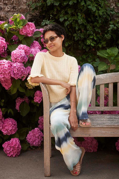 Lang Yarns breipatroon korte damestrui of t-shirt met ruffle mouwtje en fantasiepatroon. Het t-shirt is gebreid van het Langyarns garen Wooladdicts Bliss.