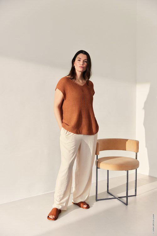 Lana Grossa breipatroonrecht dames t-shirt in patentsteek en subtiele v-hals. Deze top is gebreid van het garen Lana Grossa Solo Lino.