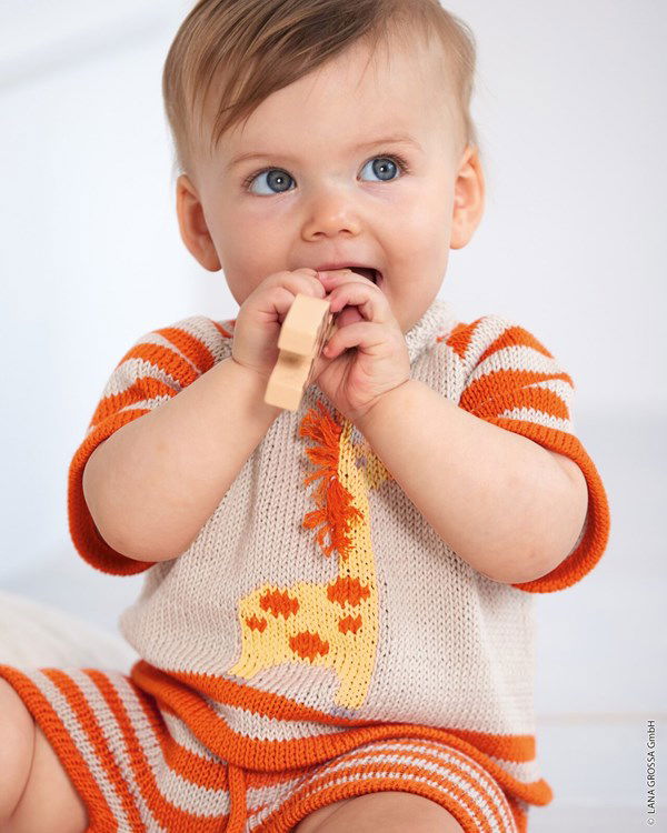 Breipatroon Lana Grossa t-shirt voor kleuter, met gestreepte mouwen en onderrand. Dit truitje met inbreipatroon van een giraf, is gemaakt van het garen Lana Grossa Elastico.