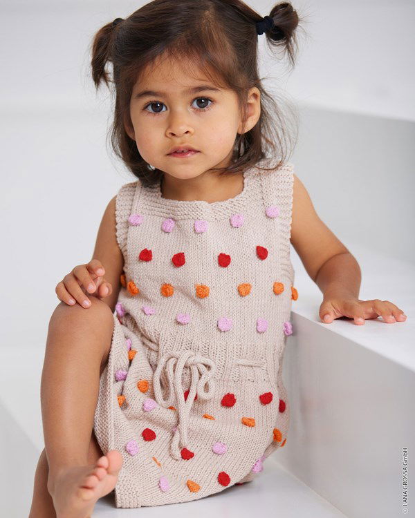 Breipatroon Lana Grossa kinderjurkje met strikkoord in de taille. Dit is jurje is in tricot, ribbel- en noppenpatroon gebreid van het garen Lana Grossa Elastico.