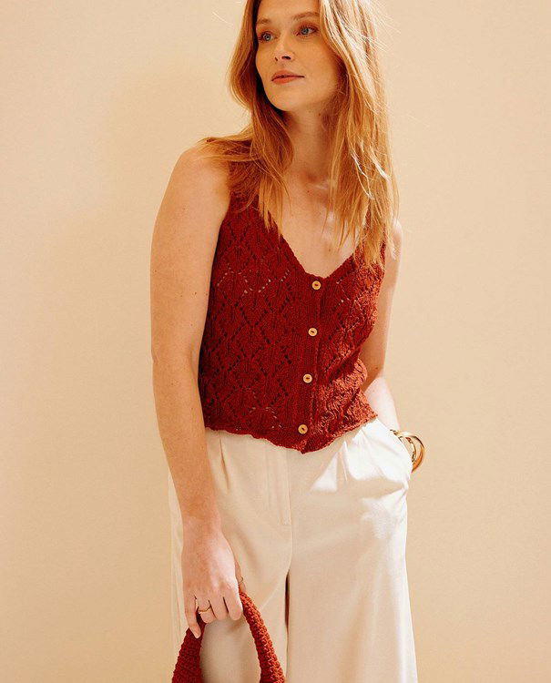 Phildar breipatroon Helga, mouwloos dameshemdje met lage V-hals. Dit in kantpatroon gebreide topje is gemaakt van het garen Phil Rustique, een garen met natuurlijk uiterlijk.