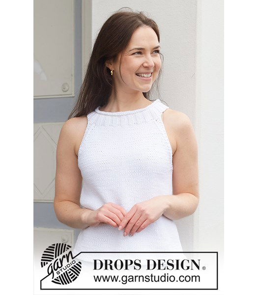 Dit is een charmante top gebreid met DROPS Paris, een stevig en natuurlijk katoengaren dat heerlijk draagt op warme dagen. Deze top wordt van onder naar boven gebreid in tricotsteek, met speelse rolranden aan de hals, armsgaten en zoom voor een nonchalant maar modieus effect. Verkrijgbaar in maten XS tot en met XXL.