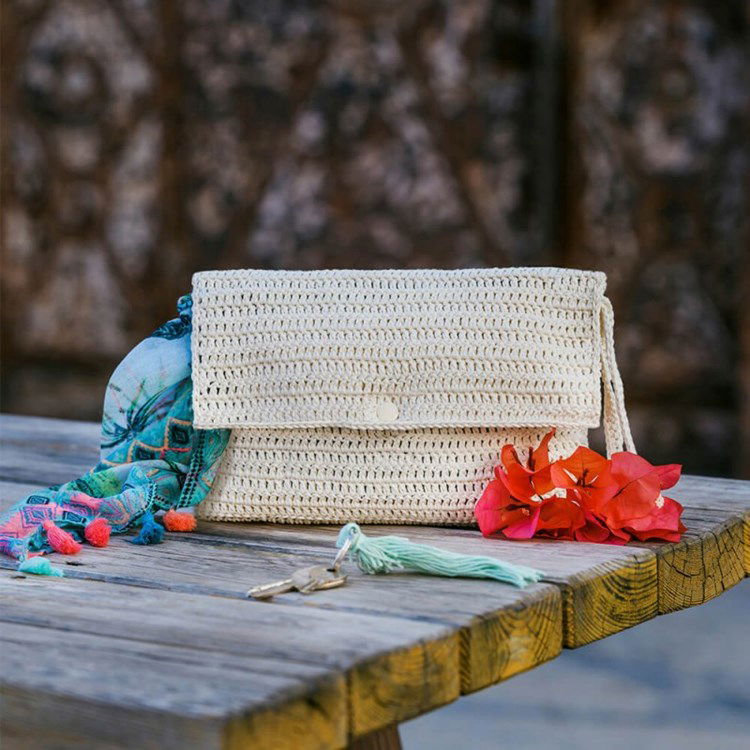 Dmc haakpatroon tasje van ca 25cm breed, 18 cm hoog en flap met knoopsluiting van 12 cm.