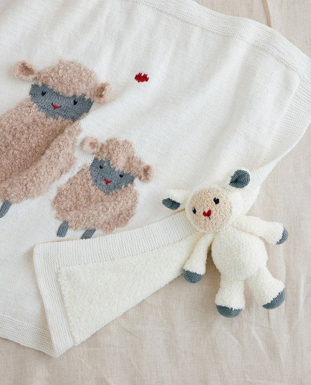 Phildar breipatroon dekentje Nelly, met inbreipatroon van schaap met lammetje. Deze heerlijk zachte deken, is gebreid van de garens Phil Partner 3,5, Douce, Alpaga Boucle en Coton Mimi.
