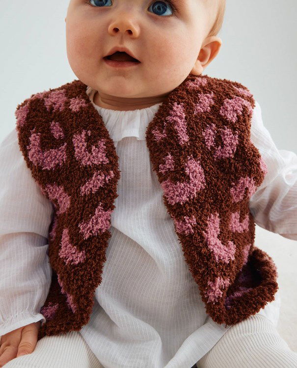 Phildar breipatroon Nasi, mouwloos babyvestje in panterprint. Dit donzige en heerlijk zachte giletje, is gemaakt van het garen Phil Douce.