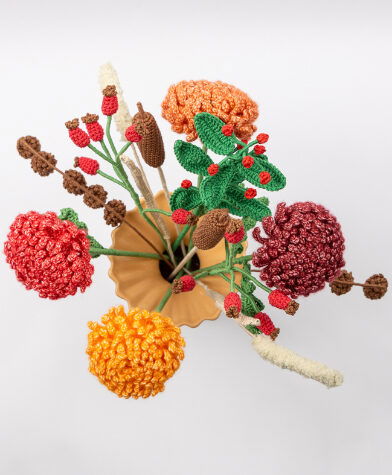 Haakpatroon kleurrijk herfstboeket, bestaande uit chrysant, rozenbotteltak, skimmia, rietpluim, lisdodde en dennenappel.