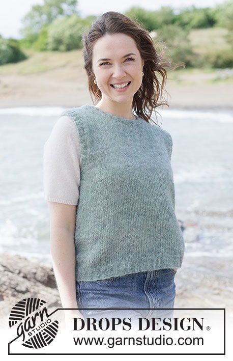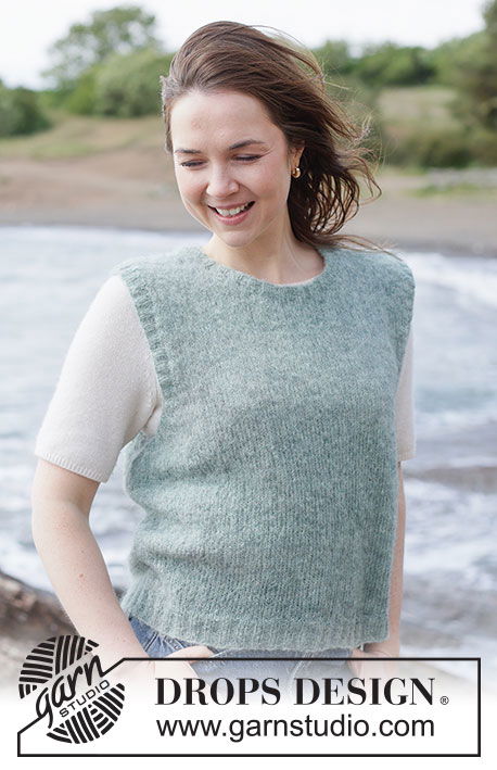 Ontdek het stijlvolle Blue Mirage Vest, een prachtig gebreide top voor dames uit de DROPS 263-30 collectie. Dit patroon is ontworpen voor een naadloze afwerking, waarbij het werk van onder naar boven in de rondte wordt gebreid tot aan de armsgaten. Elk voor- en achterpand wordt vervolgens apart afgewerkt.