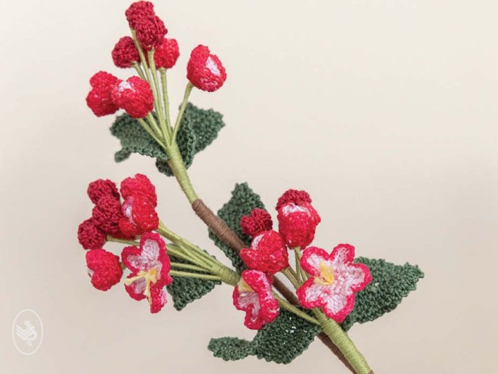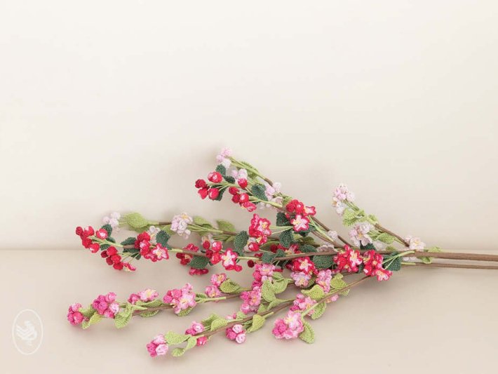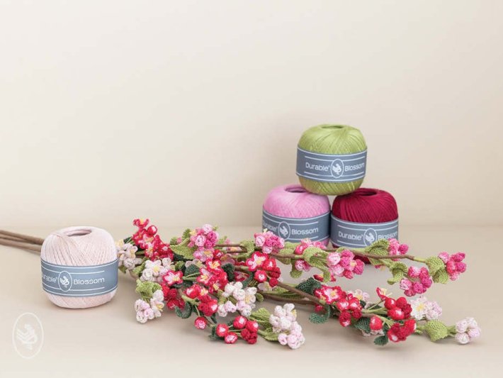 Durable haakpatroon appelbloesemtak, met frisse bloemblaadjes en kleine bloemknopjes en bloemetjes. Deze sfeervolle woondecoratie, voor boeket of tafeldecoratie, is gehaakt van het fijne haakgaren Durable Blossem.