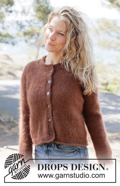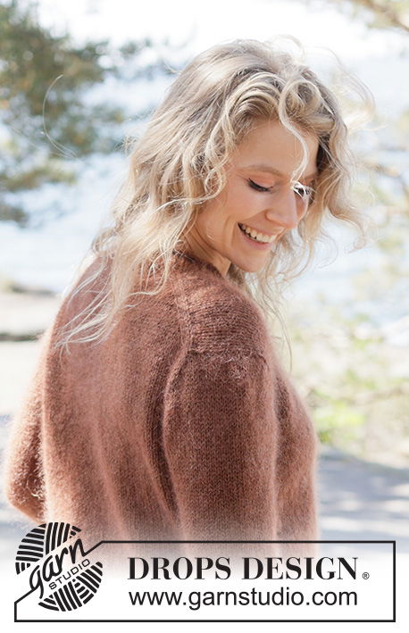 Drops breipatroon kort damesvest met iets afhangende mouw en knoopsluiting. Het vestje is van boven naar beneden gebreid met 1 draad Drops Nord en 2 draden Drops Kid Silk.