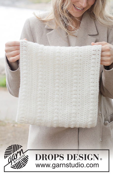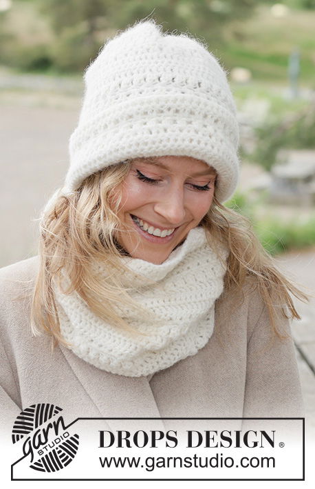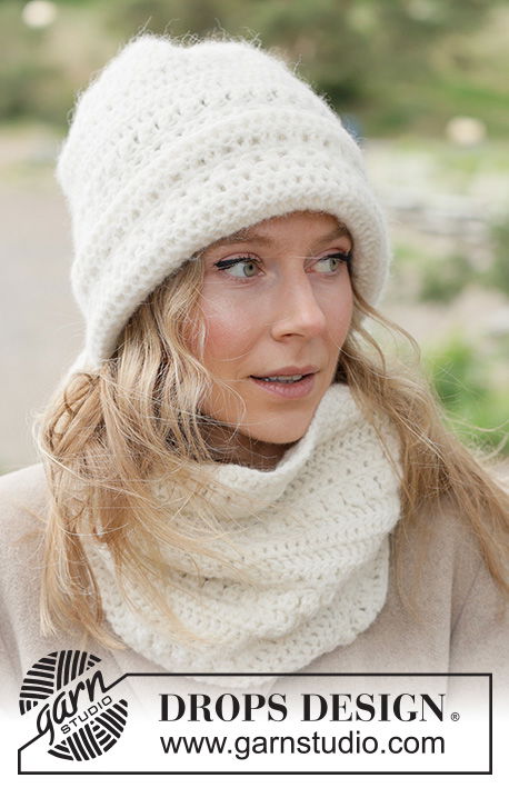 Drops haakpatroon Ivory Drift Set, muts en halswarmer in verschillende haakpatronen. Deze winterse set is gehaakt van het garen DROPS Air.