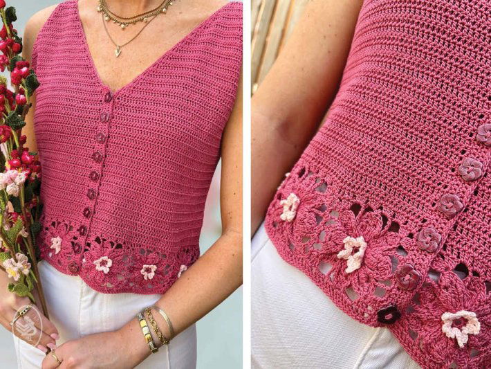 Durable haakpatroon Blossom Top, mouwloos damesvest met knoopsluiting en V-hals. Dit zomerse topje is een ontwerp vanAlexa Boonstra en is gehaakt van het garen Durable Blossom.