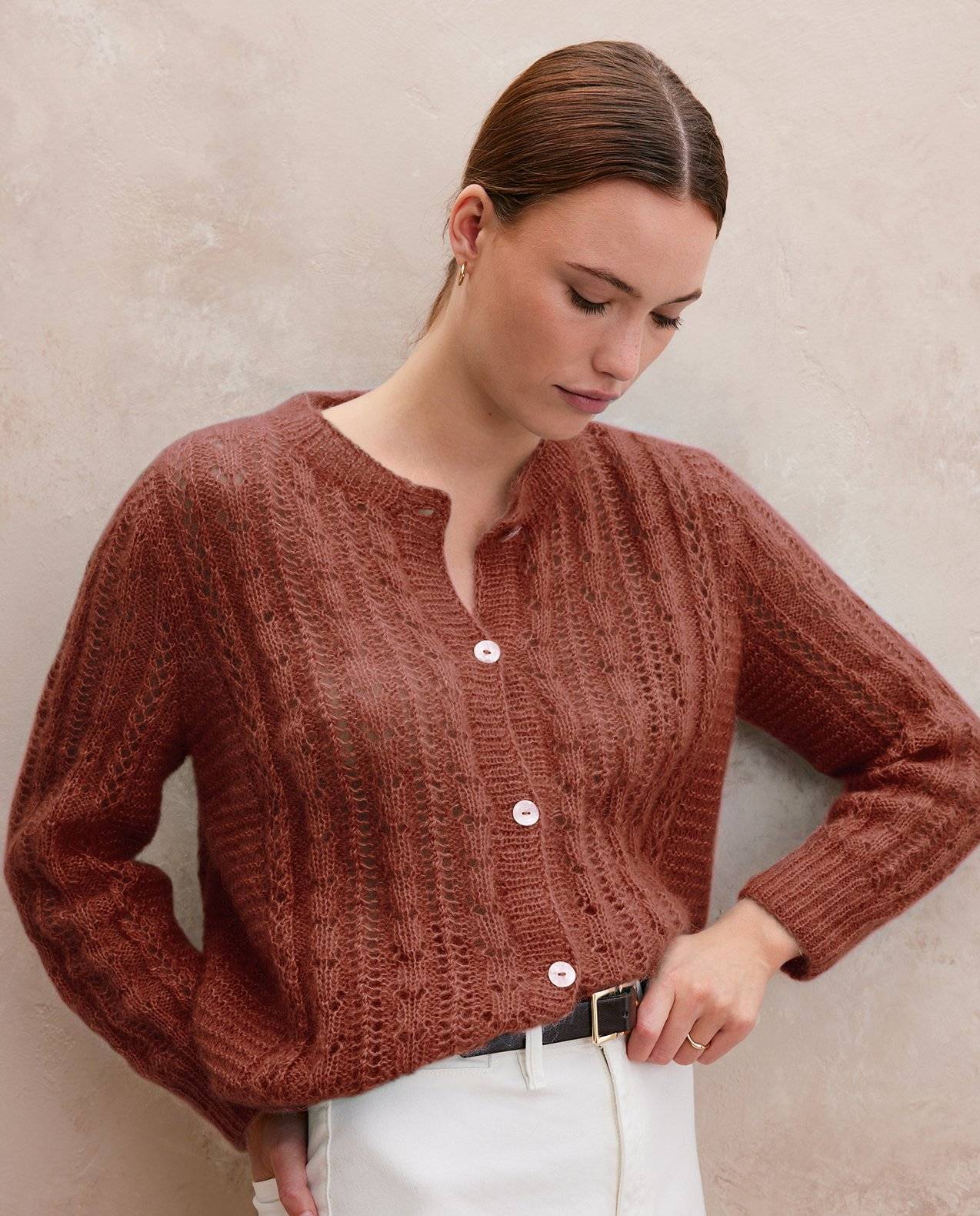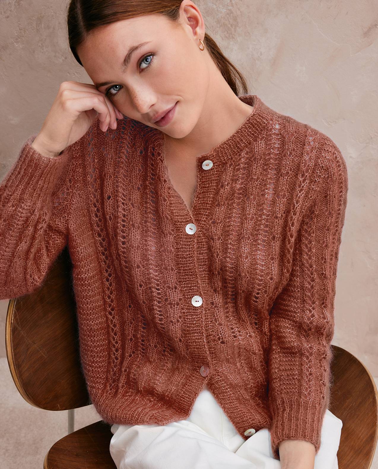 Phildar breipatroon Cindy, damesvest met ronde hals en knoopsluiting. Dit elegante vest is gemaakt van het garen Phil Mohair Soie, welke een zacht, licht en heerlijk warm effect geeft.