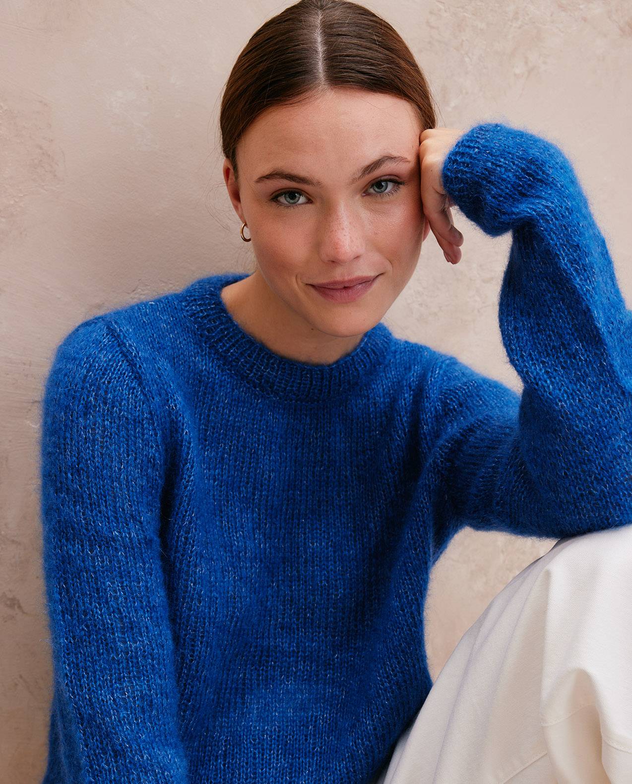 Phildar breipatroon Valmy, een tijdloze damestrui gebreid in tricotsteek. Deze trui is gemaakt van de garen Phil Mohair Soie en Soie Lurex, voor een kleine glinstering.