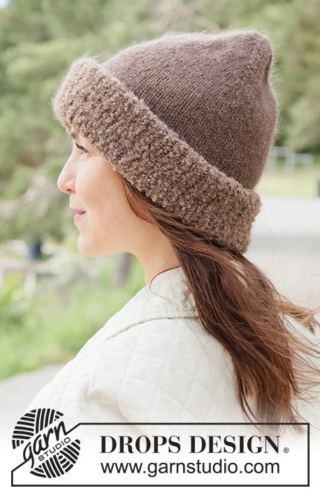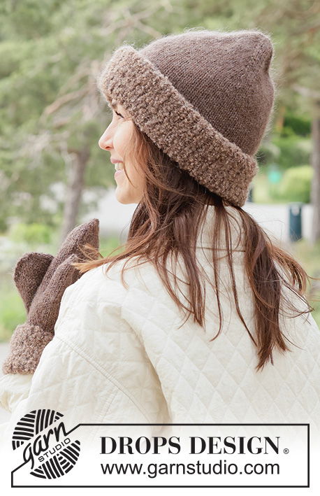 Breipatroon muts met omslag. De omslag wordt gebreid met 1 draad Drops Alpaca Bouclé en 1 draad Drops Kid Silk wat zorgt voor een speels effect en knuffelbaar uiterlijk. De muts zelf wordt gebreid van 1 draad Drops Puna met 1 draad Drops Kid Silk.