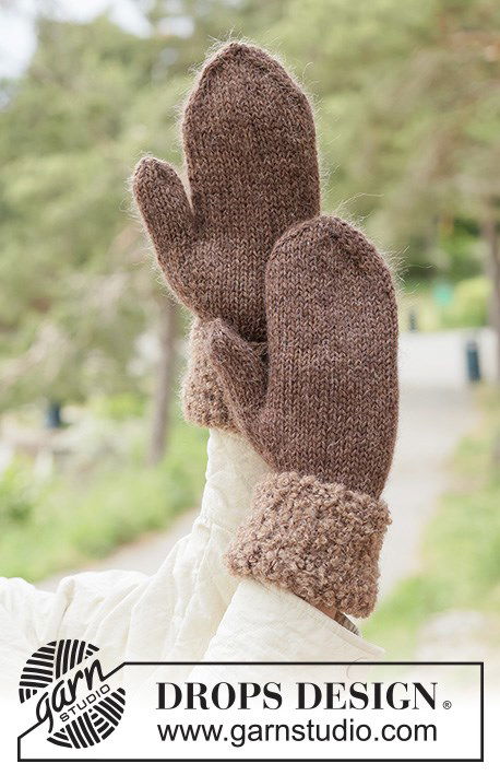 Breipatroon wanten met omslag. De omslag wordt gebreid met 1 draad Drops Alpaca Bouclé en 1 draad Drops Kid Silk wat zorgt voor een speels effect en knuffelbaar uiterlijk. De handschoenen zelf worden gebreid van 1 draad Drops Puna met 1 draad Drops Kid Silk.