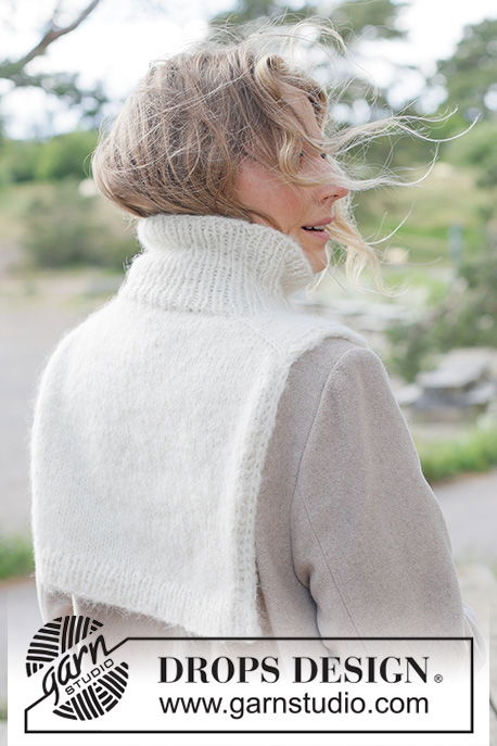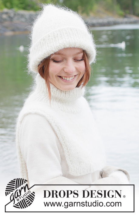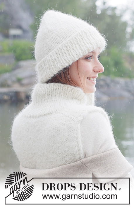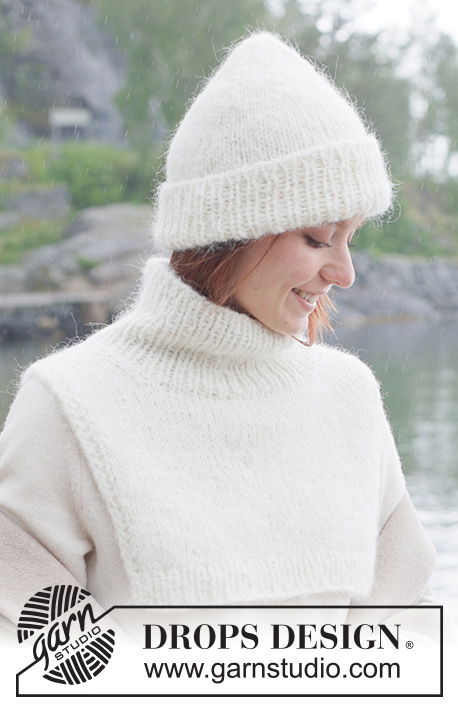 - De set wordt gebreid met een dubbele draad van de luxueuze DROPS Melody (een blow yarn van alpaca, wol en polyamide) en de 100% alpacawol DROPS Puna (beide Garengroep B + D of E).