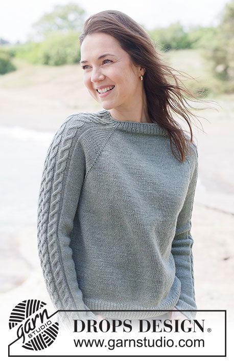 Drops breipatroon Tempest tide sweater, damestrui met fraai kabelptroon lopend van de achouders over de mouwen. Deze luxe trui is gemaakt van het licht elastische garen Drops Merino extra fine.