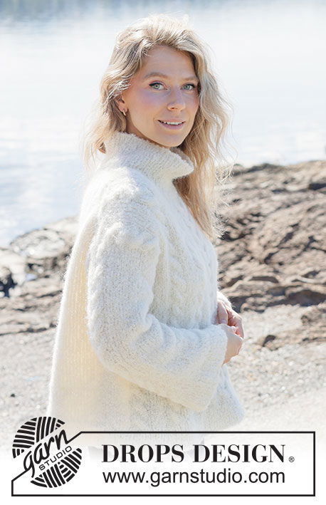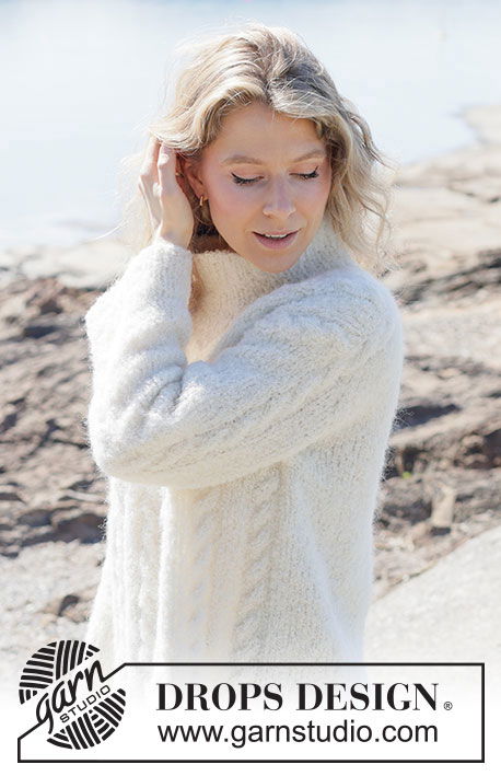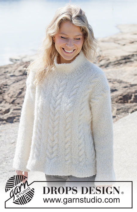 Drops breipatroon Moon Thread sweater, dametrui met iets wijde opstaande halsboord. Deze heelijk warme trui met kabelpatroon, is gemaakt van de garens Drops Alpaca Bouclé en Kid silk.
