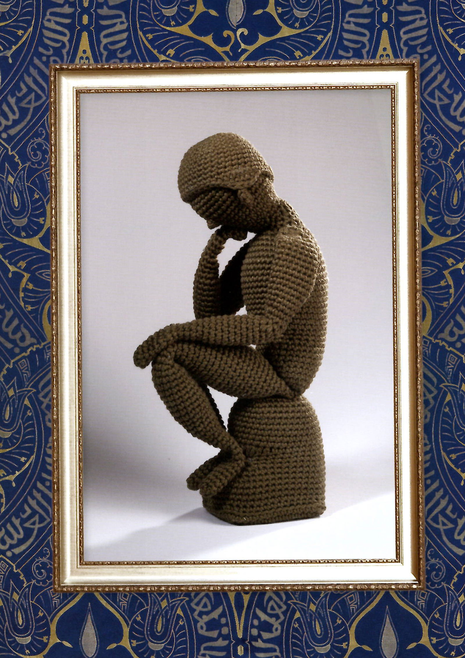 Haakpatroon De Denker van Christel Krukkert, met als inspiratiebron de Franse knustenaar Augustus Rodin. Het oorspronkelijk in brons gemaakte beeld, is nu te haken van het garen Scheepjes Cotone op haaknaald nr 2,5