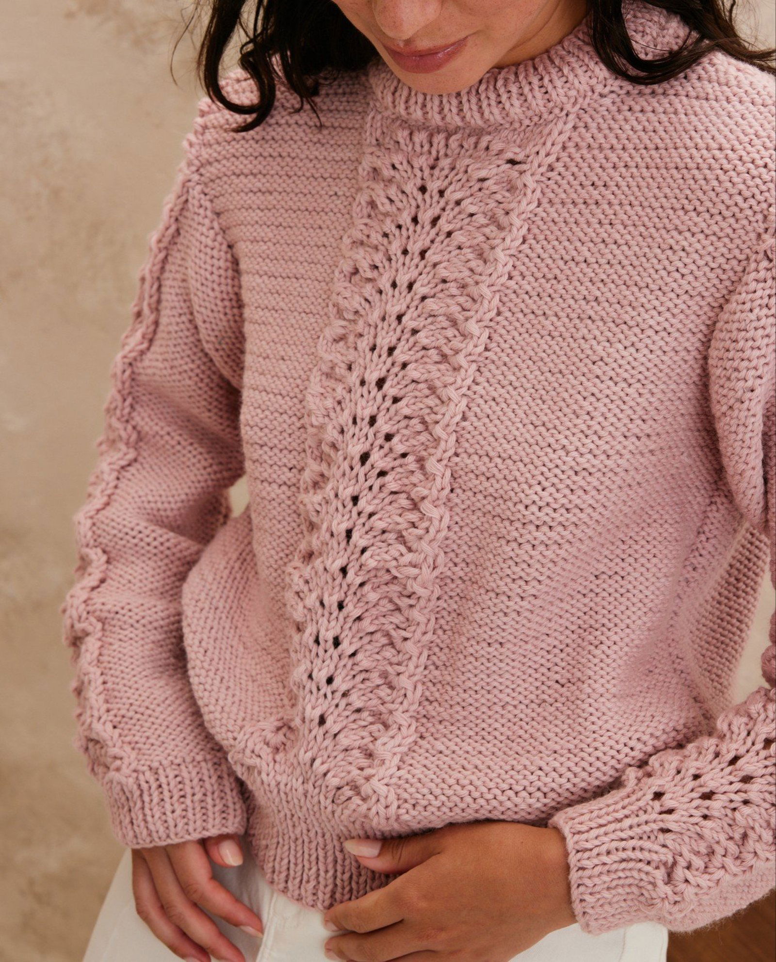 Phildar breipatroon damestrui Ysidor, met fraai kantpatroon in voorpand en mouwen. Deze trui is gemaakt van het garen Phil Imaginaire 6, welke het stekenpatroon goed laat uitkomen.
