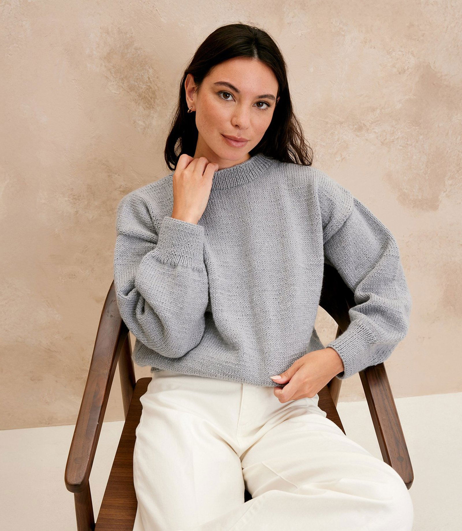 Phildar breipatroon damestrui Ypolite, met ronde hals. Deze trui is gemaakt van het garen Phil Imaginaire 3,5, in tricotsteek.