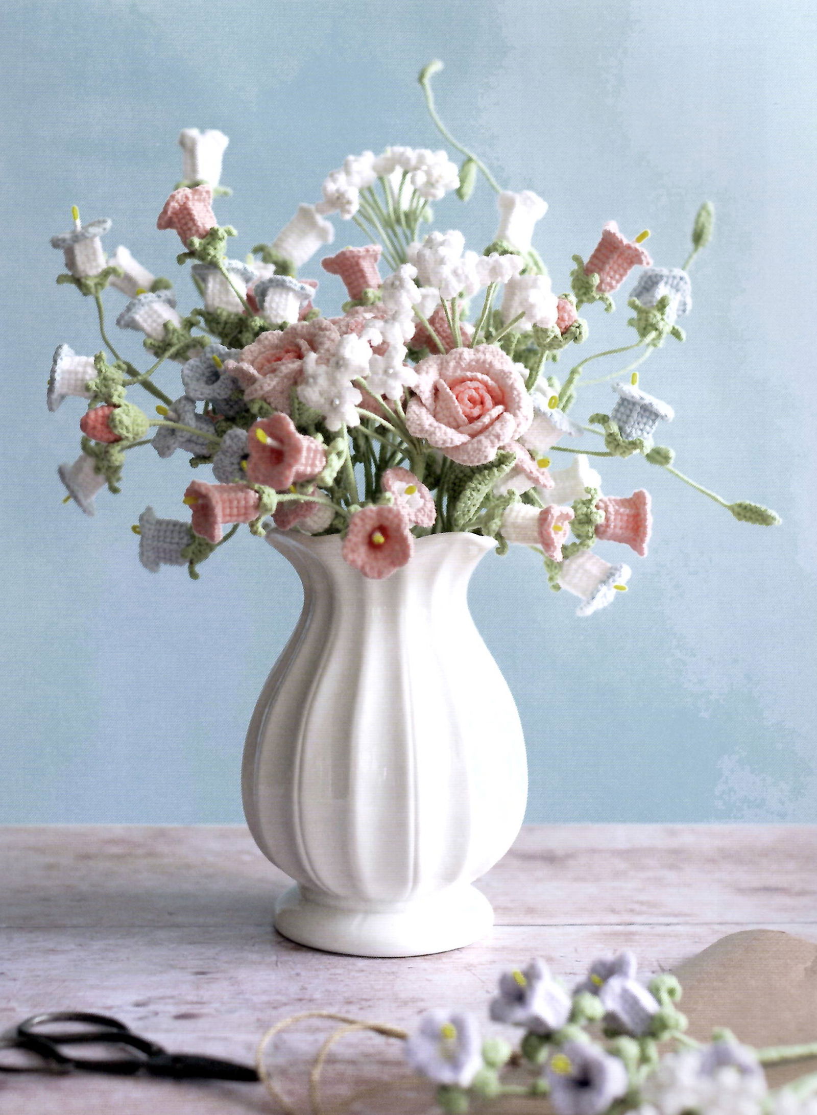 Haakpatroon bloemenboeket met rozen, klokjes, gipskruid, madeliefjes en plataargras. Deze bloemen hebben geen verzorging nodig en maken met hun charme elk vertrek mooier!