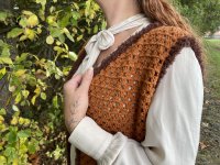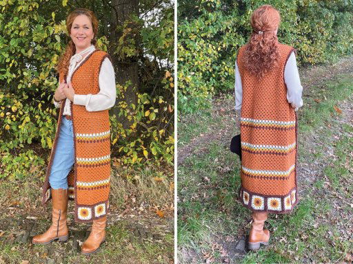 Haakpatroon mouwloos vest gehaakt in de kleuren van de herfst met het zachte Cosy fine garen.De klassieke granny squares geven het een speelse, retro uitstraling, terwijl de lengte zorgt voor een elegant en modern silhouet. Draag het over een jeans voor een casual boho-look, of combineer het met een jurk voor een stijlvolle, unieke outfit. Het gebruik van het Teddy garen langs de randen van dit vest en tussen de vierkantjes geeft net dat leuke accent.