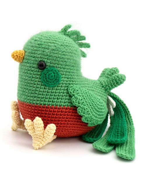 Haakpatroon van quetzal Emerald, zijn smaragdgroene veren glanzen als juwelen en zijn lange staart golft elegant achter hem aan. Emerald is ongeveer 16 cm groot, en is gehaakt van het garen Ricorumi DK.